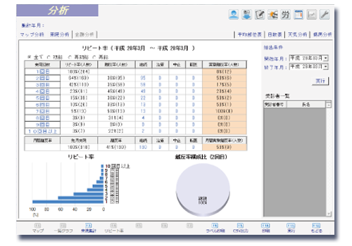 - 院の患者様のリピート率、離反率、来院傾向がひと目で把握できる