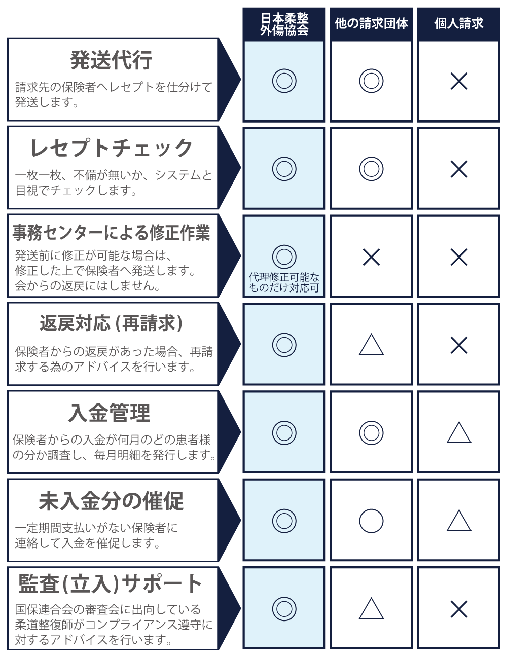 日本柔整外傷協会では請求代行では珍しい「請求額に応じた%なし」の会費固定月額制を採用しています。