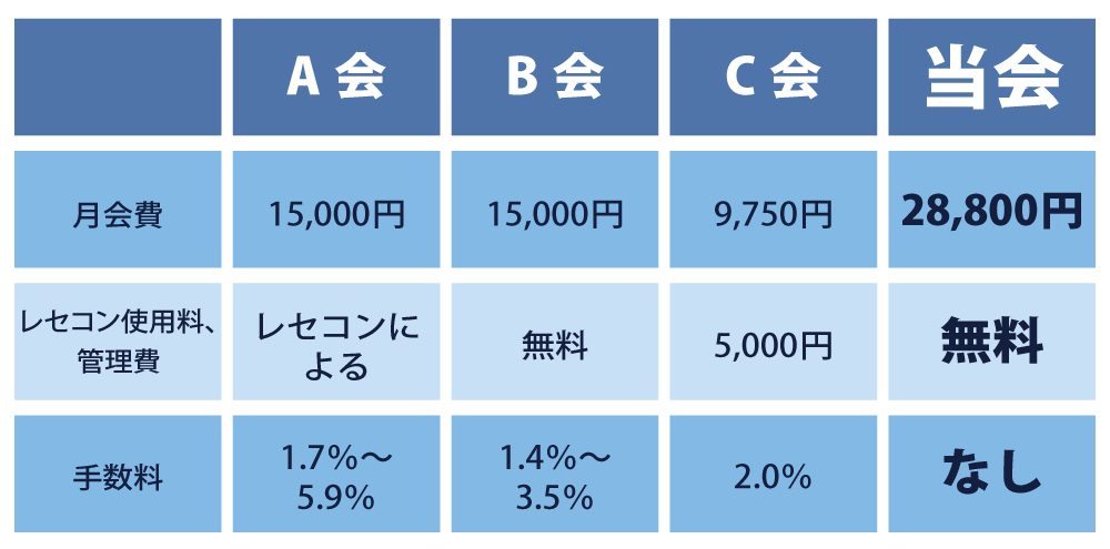 当会では請求代行の手数料を徴収していないため、他会とは対照的に月の請求額が増えれば増えるほど、多ければ多いほど入会後の月費用が割安になります。